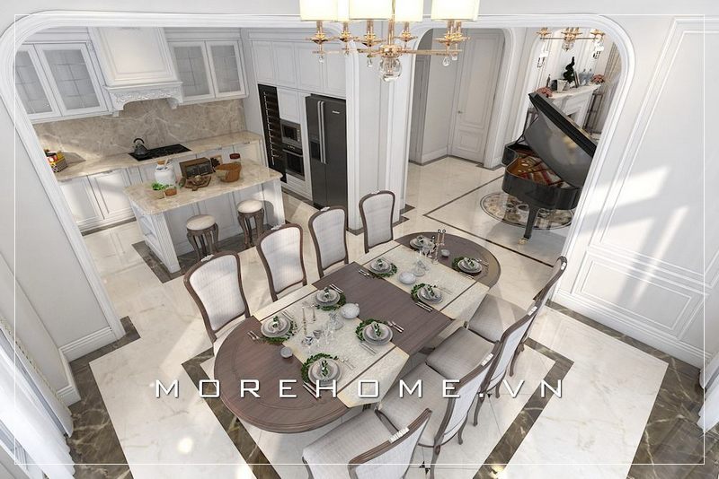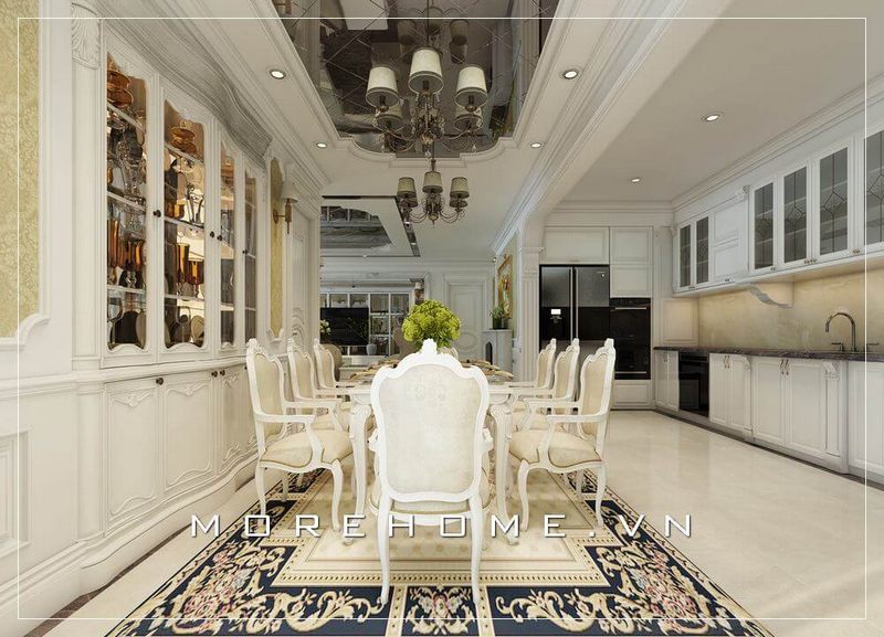 Thiết kế phòng ăn rộng thoáng đãng theo phong cách hiện đại với tâm điểm bộ bàn ghế lớn chính giữa đầy tinh tế và sang trọng.