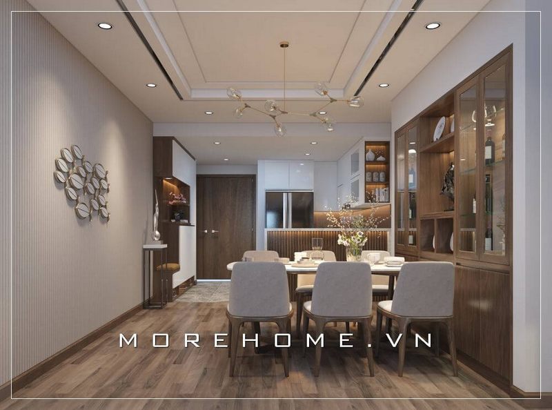 Không gian phòng ăn với mẫu bàn ăn gỗ công nghiệp hiện đại, sang trọng, bộ bàn ăn 6 ghế đã mang đến không gian ăn uống ấm cúng, tiện nghi.