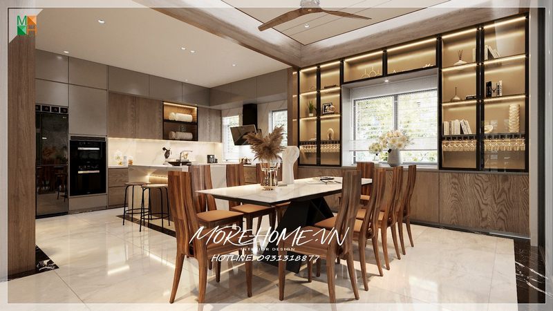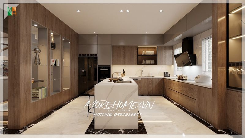 Tủ bếp chữ L gỗ tự nhiên được thiết kế một cách linh hoạt và khéo léo, kết hợp bàn bàn đảo được đặt ở chính giữa tạo sự bề thế, sang trọng cũng như đẳng cấp của chủ nhân ngôi nhà