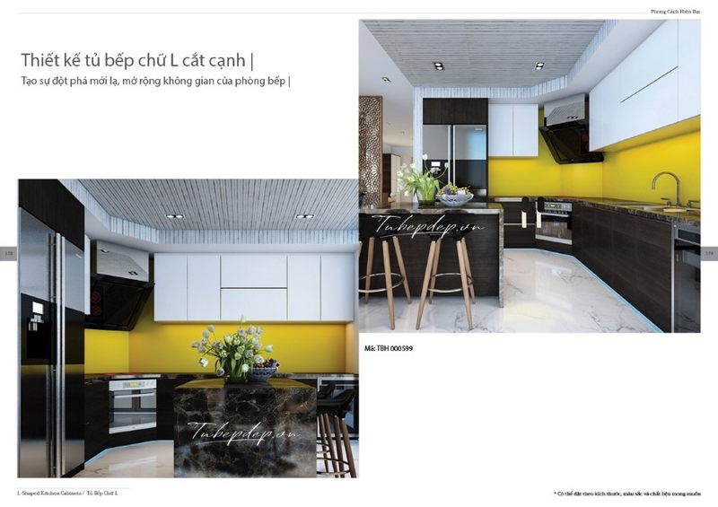 Tủ bếp hiện đại kiểu dáng chữ L tận dụng tối đa được góc khuất của phòng bếp mang lại không gian rộng và thoáng hơn