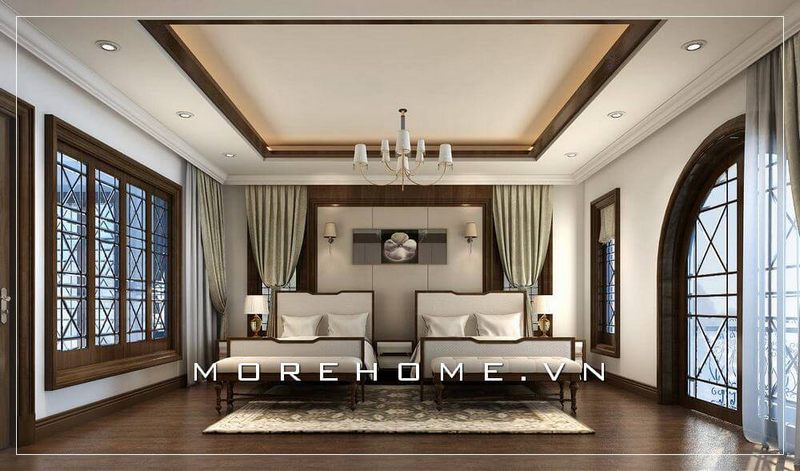 Trang trí nội thất phòng ngủ biệt thự cao cấp tại Hà Nội với mẫu giường ngủ gỗ óc chó nhập khẩu bọc nỉ nhung ấn tượng