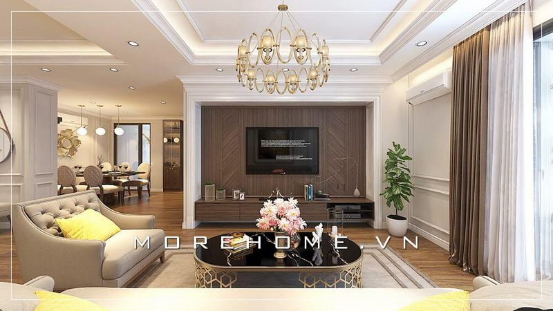 Mẫu sofa gỗ óc chó bọc nỉ phong cách tân cổ điển đẹp tại căn hộ Duplex Thanh Xuân Hà Nội