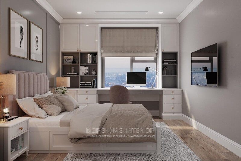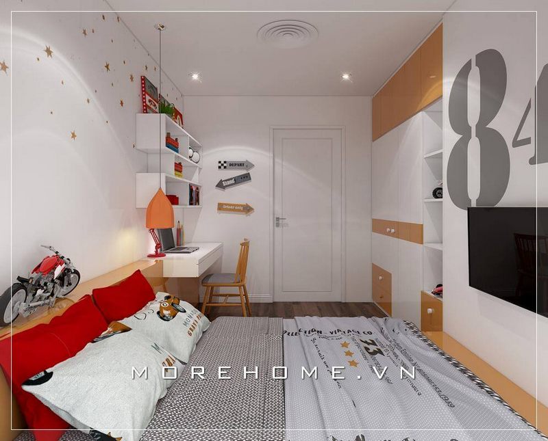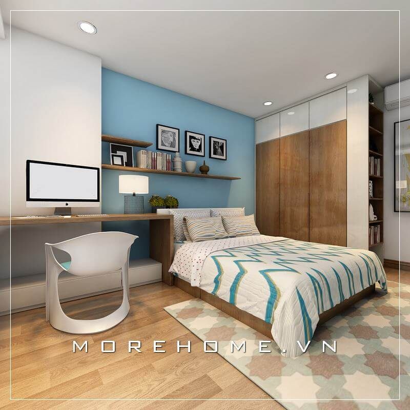 Bố trí nội thất phòng ngủ chung cư nhỏ hiện đại, khoa học, giường ngủ, tủ kệ, bàn học được sắp xếp hợp lí giúp cho căn phòng thêm thoáng rộng hơn