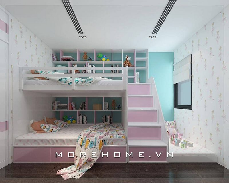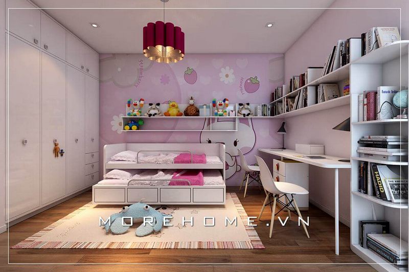 Nội thất phòng ngủ hiện đại, trẻ trung, cách bố trí hợp lí, gọn gàng tạo độ rộng thoáng hơn cho căn phòng ngủ trẻ em nhỏ