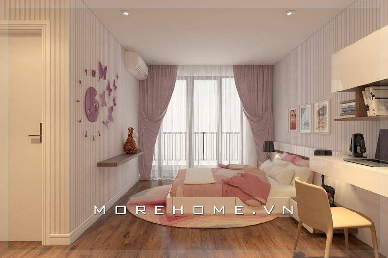 Mẫu thiết kế nội thất phòng ngủ đẹp với cách bố trí nội thất một cách hợp lí, khoa học mang đến sự nhẹ nhàng, dễ thương với tone màu hồng cho phòng ngủ của bé gái