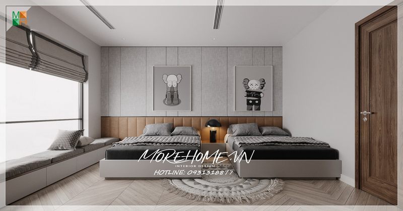 Nhằm mang đến một không gian nghỉ ngơi cho bé hoàn hảo nhất, việc sắp xếp nội thất sao cho hiệu quả. Được đặt hai chiếc giường có kích cỡ giống nhau, màu sắc trung tính phù hợp cho các cặp sinh đôi bé trai