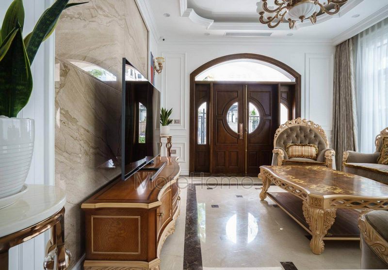 Mẫu cửa gỗ 2 cánh màu nâu sang trọng tạo điểm nhấn cuốn hút cho phòng khách biệt thự tân cổ điển