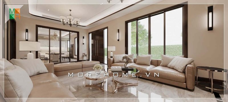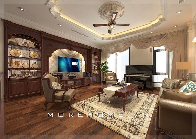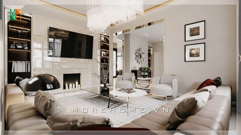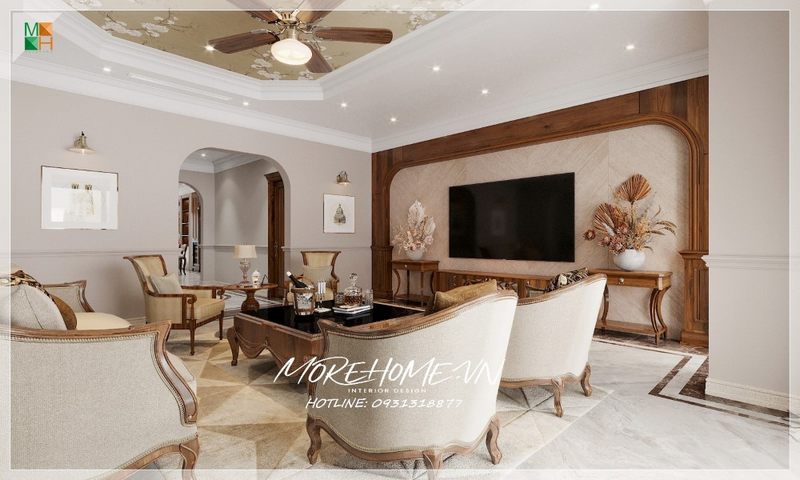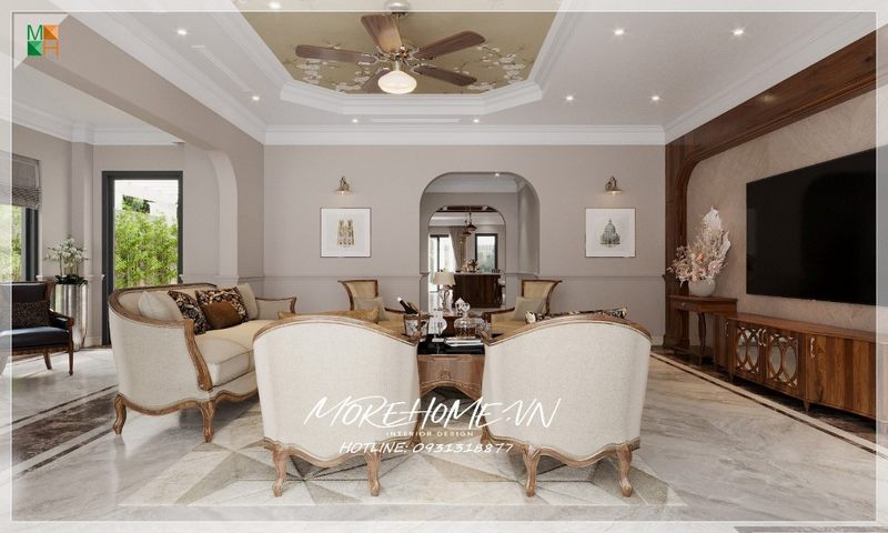 Hình ảnh phòng khách biệt thự tân cổ điển thực tế được thi công hoàn thiện bởi công ty nội thất Morehome