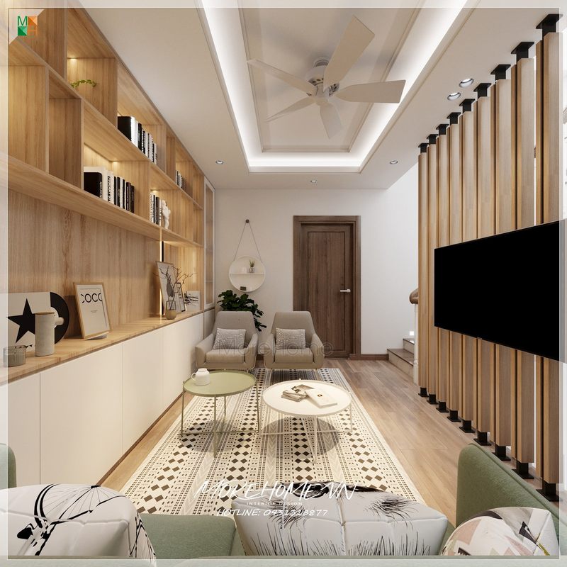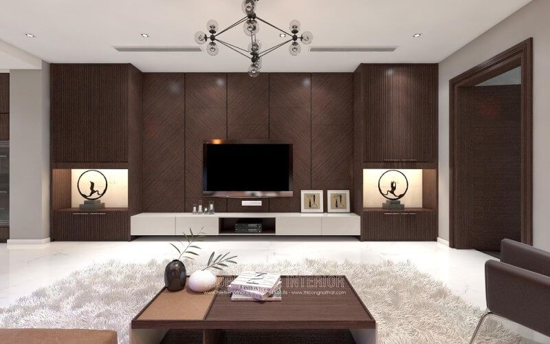 Bức tường thô cứng đơn sắc được thay thế bằng thiết kế tủ gỗ, kệ ti vi và kệ đồ kết hợp vừa đảm bảo tính công năng lại giúp tăng độ thoáng và tạo sự cơi nới tự nhiên cho không gian sinh hoạt chung.