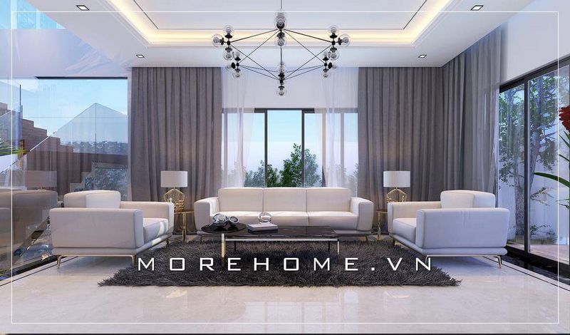 Mẫu thiết kế nội thất phòng khách hiện đại với tông màu trắng tinh tế, mang đến không gian tiếp khách lí tưởng