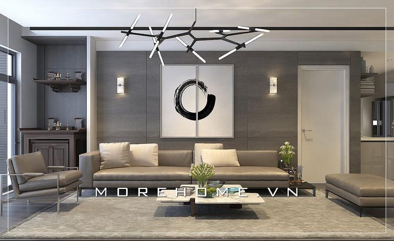 Mẫu thiết kế phòng khách hiện đại cho căn hộ sang trọng, đẳng cấp với sự kết hợp với tone màu xám của nội thất độc đáo tạo nên tổng thể không gian hài hòa, ấm cúng và cuốn hút