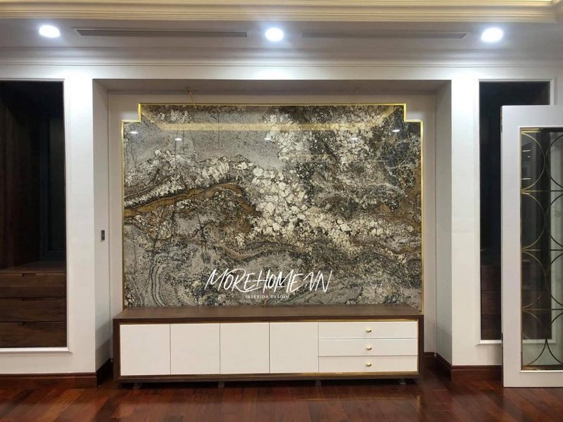 Để hoàn thiện phòng khách của căn biệt thự tân cổ điển, Morestone thi công đá ốp tường tự nhiên có vân đối nhau đem đến sự cao cấp, sang trọng mà thời thượng cho căn phòng.